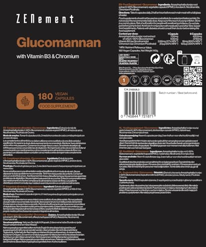 Specificaties: Glucomannan 4200 mg per Dosering, met Vitamine B3 & Chroom – Konjac Wortelvezel – Verzadigend Effect, Ondersteunt Gewichtsbeheersing – 180 Vegan Capsules – Zenement